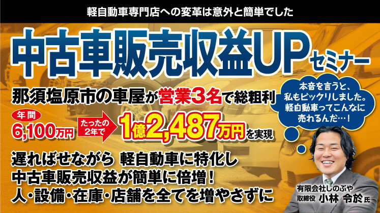 驚異の在庫回転率50%以上を実現、販売台数前年比130%を達成した有限会社しのぶや様の【商品・集客・営業/組織】の戦略について、取締役の小林 令於氏にご登壇いただき、徹底解説するセミナーの開催が決まりました。
