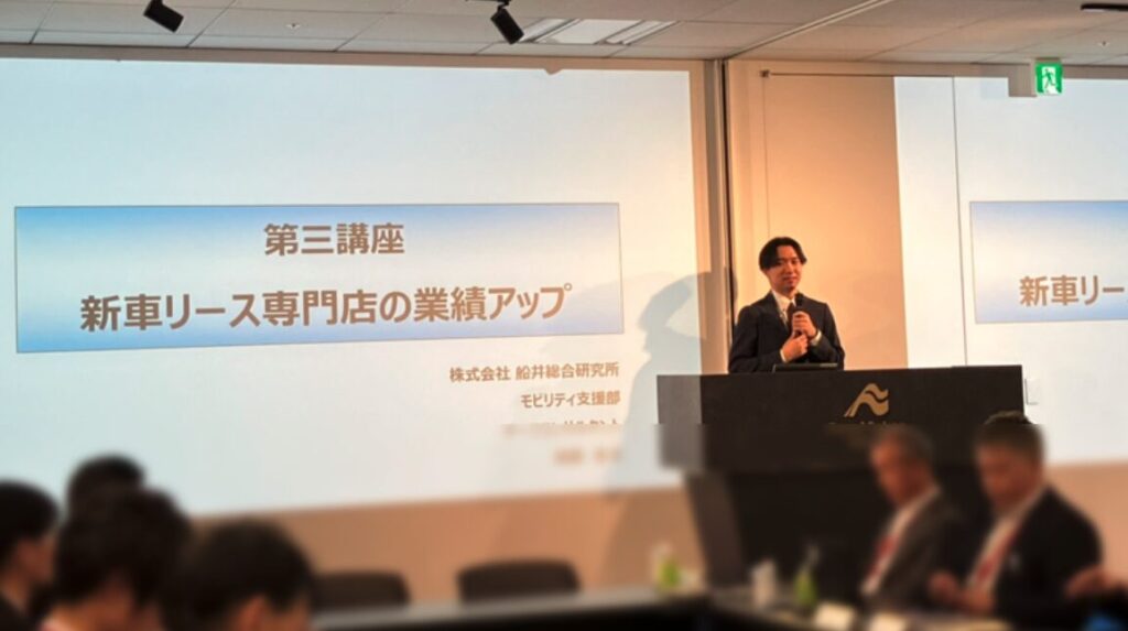 第三講座では、「新車リース専門店の業績アップ」と題しまして、船井総合研究所 モビリティ支援部 チーフコンサルタント 遠藤よりお送りしました。