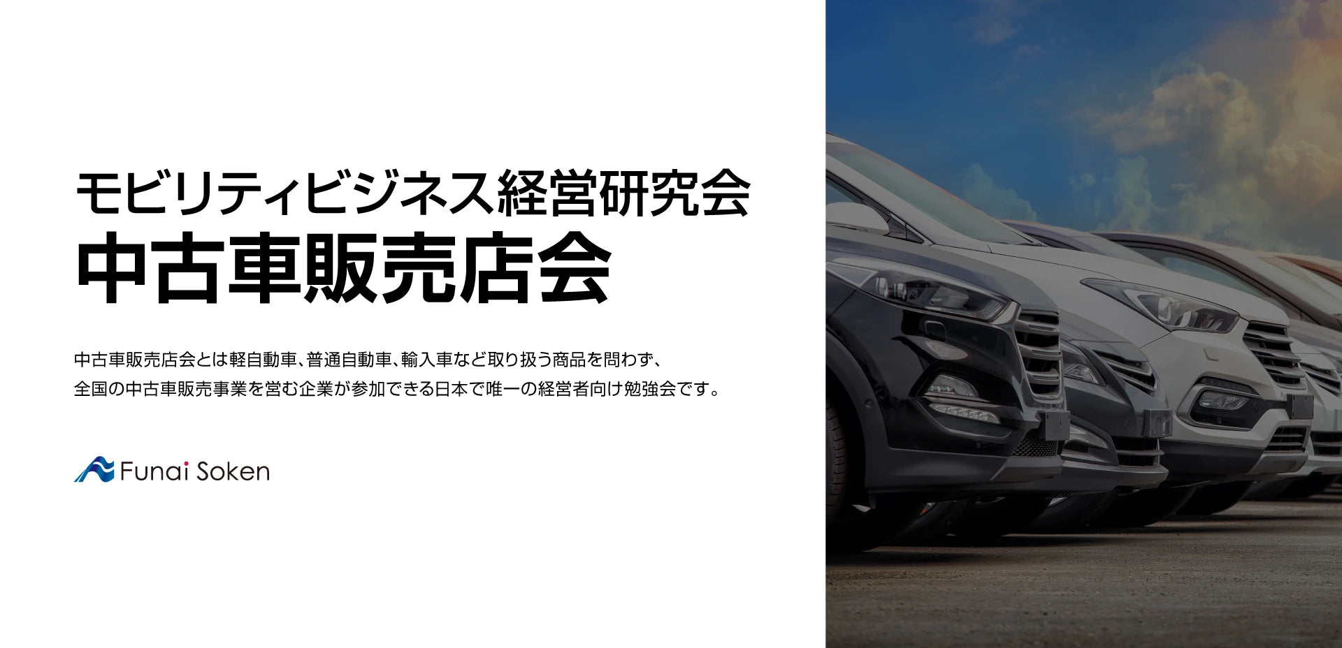 軽自動車販売に特化した専門店経営者のための、会員制勉強会です。業界トピックスや販売・整備・鈑金・採用といったテーマの時流についての講座、同業者との情報交換、ゲスト講師を招いた勉強会、視察ツアーなど内容充実!